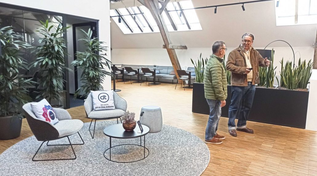 Marc Baumüller zeigt Redakteur Dennis Dirigo die Büroräume Datatronic