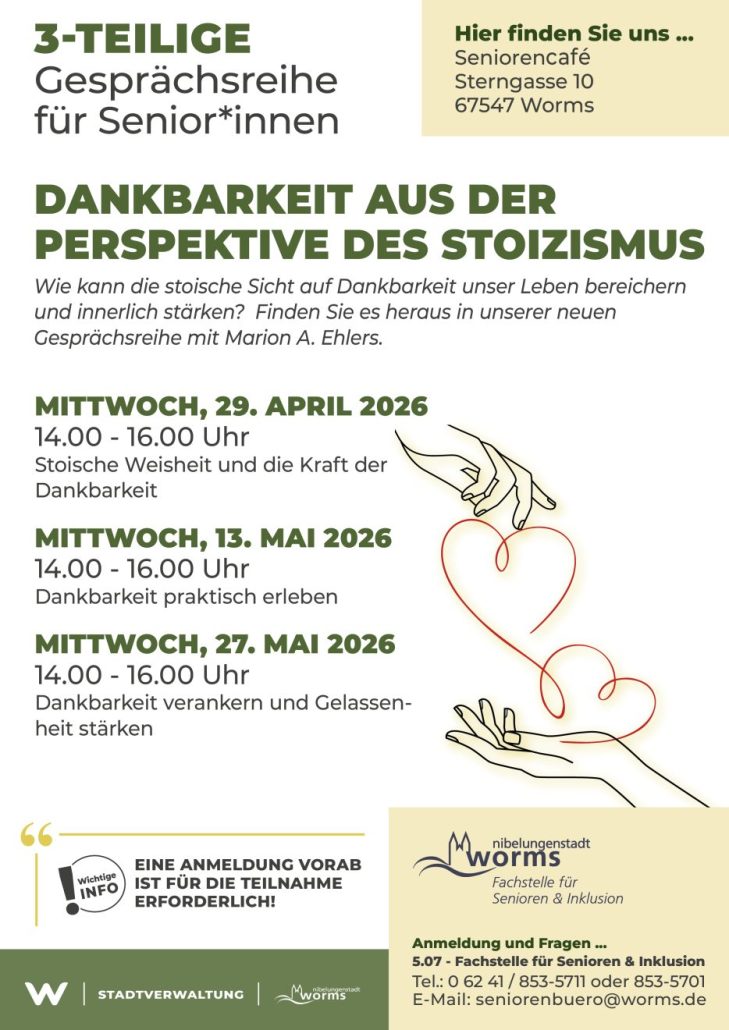 • Mittwoch, 29. April, 14 – 16 Uhr: „Stoische Weisheit und die Kraft der Dankbarkeit“