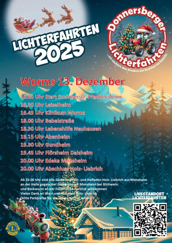 Mit insgesamt vier Lichterfahrten in der Region bringen der Winzer Thilo Holstein und sein Team wieder Kinderaugen zum Leuchten. In Worms sind die festlich geschmückten Zugmaschinen am 13. Dezember 2025 ab 16 Uhr in vorweihnachtlicher Mission unterwegs.