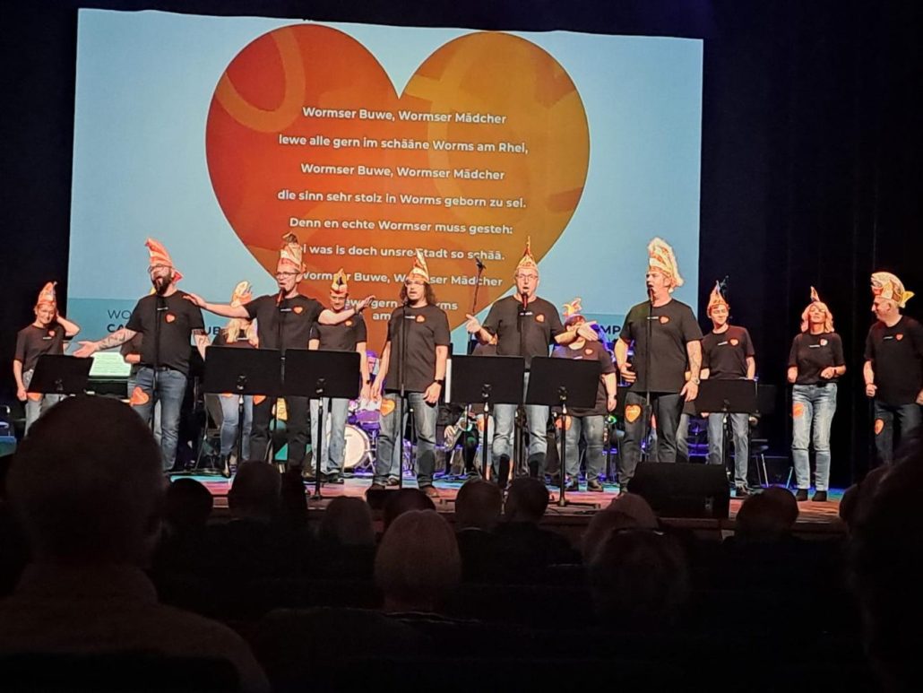 Bevor Oberbürgermeister Kessel das Schlusswort ergriff, steuerte der Abend auf einen weiteren Vereinshöhepunkt zu, nämlich der Vereinigung aller Wormser Fastnachtsvereine live auf der Bühne des Wormser Theaters. Vorberei- tet hatten diese ein Medley aus Wormser Fastnachtsliedern, denn schließlich stand der Abend im Zeichen der omnipräsenten #wormsliebe Kampagne. Mit viel Inbrunst und noch mehr Wormsliebe im Brustkorb intonierten die Vereine die Lieder „So schää kann Worms soi“ zur Melodie von „My Way“ (Wormser Narrhalla), „Ich bin en Wormser“ (Wormser Hausfrauenverein) zur Melodie von „Dorfkind“, während der Wormser Liederkranz zur bekannten Melodie von „Sweet Caroline“ die Marktwinzer besang. Gab es bereits zu diesem Zeitpunkt kaum noch ein Halten auf den Sitzen im Theatersaal, erlebte der Abend seinen definitiven Höhepunkt mit dem WCC und dem Klassiker „Wormser Buwe – Wormser Mädcher“. Klar, dass die Zuschauer es sich nicht nehmen ließen, die altbekannten Zeilen begeistert mitzusingen. Zugleich war der Auftritt der Vereine ein eindrückliches Zeichen dafür, dass gemeinsam einfach stark ist.