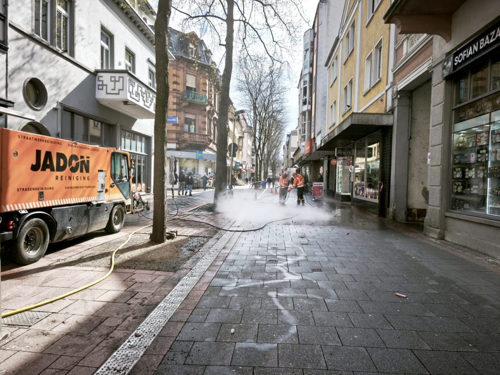 Hierfür hat Stadtentwicklungsdezernent Timo Horst das niederländische Unternehmen Jadon Reinigung nach einer europaweiten Ausschreibung engagiert. Mit zwei Spezialfahrzeugen ausgestattet, die genau für die Beseitigung solches Problemschmutzes entwickelt wurden, arbeitet sich die Firma vom Bahnhof bis zum Römischen Kaiser und vom Marktplatz über den Ludwigsplatz zum Ende der Kämmererstraße. „Wir verzichten bewusst auf den Einsatz chemischer Reinigungsmittel, um Natur und denkmalgeschützte Gebäude zu schonen“, erklärt Horst. Stattdessen kommen Spezialfahrzeuge zum Einsatz, die mit über 100 Grad heißem Wasserdampf und Hochdruck arbeiten. Ein integriertes Absaugsystem nimmt das Schmutzwasser sofort auf, sodass die Flächen unmittelbar nach der Reinigung wieder sauber und trocken begehbar sind.