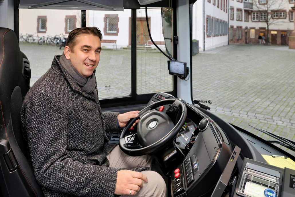 Probeweise nahm auch Stadtentwicklungsdezernent Timo Horst auf dem Marktplatz hinterm Steuer eines neuen E-Busses Platz.