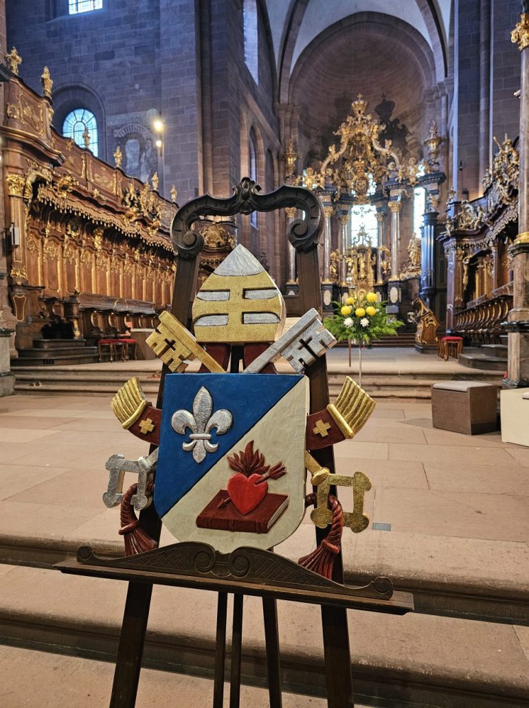 Am 8. Mai wurde Robert Prevost zum Papst gewählt und gab sich den Namen Leo XIV. Als Päpstliche Basilika steht der Wormser Dom in einer besonders engen Beziehung zum Apostolischen Stuhl in Rom, deshalb waren auch die Vorgänge um den Tod von Papst Franziskus und die Wahl des neuen Papstes in Worms besonders aufmerksam verfolgt worden. Da über den Eingangsportalen der Päpstlichen Basiliken in der Regel das Wappen des jeweils regierenden Papstes angebracht ist, stehen nach der Wahl eines neuen Papstes diese Kirchen – in Deutschland sind es etwa 120 Kirchen, die diesen besonderen Ehrentitel tragen dürfen – vor der Herausforderung, das alte Papstwappen durch das neue zu ersetzen. Wo aber bekommen die Basiliken das Wappen her?