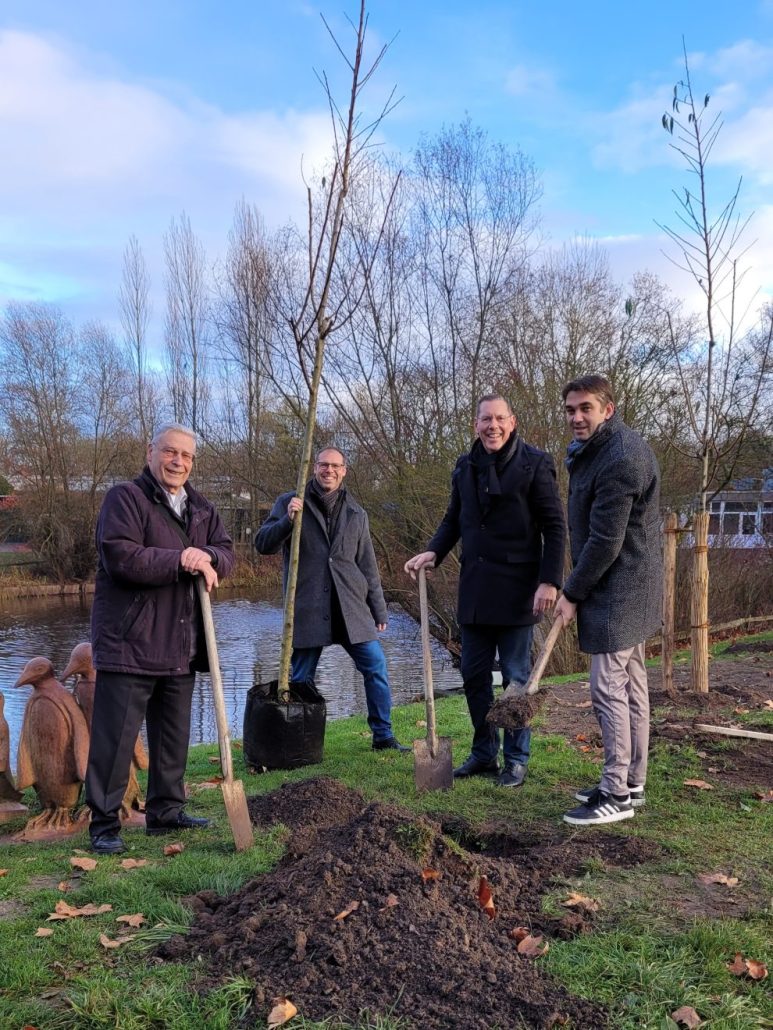 Foto © Tiergarten Worms gGmbH, Nina Hochstrasser: Bei der Baumpflanzung (v.l.) Achim Herb (Freundeskreis Tiergarten), Steffen Burdack und Frank Belzer (Rheinhessen-Sparkasse), und Beigeordneter Timo Horst.