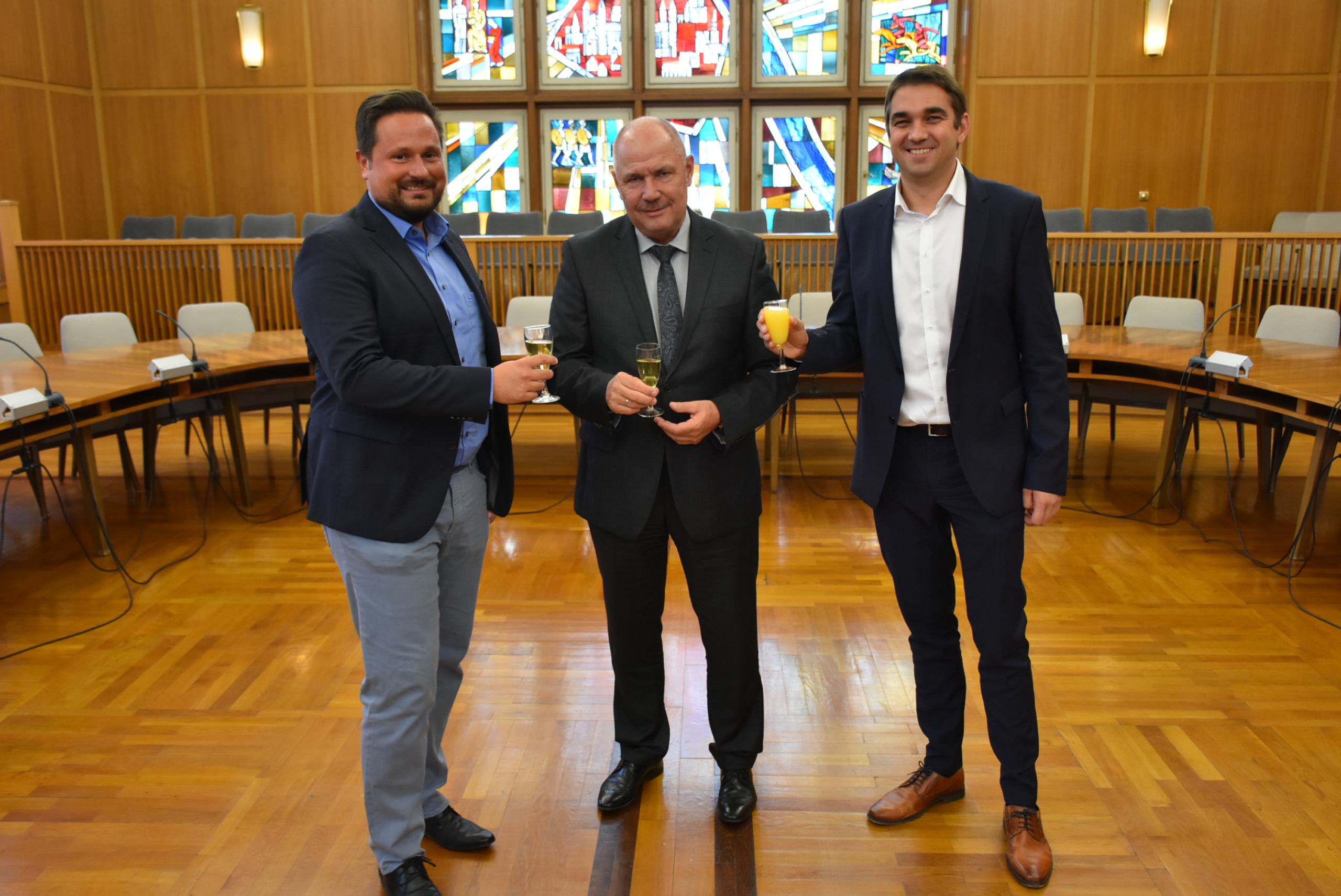 Bild zur Vergrößerung bitte anklicken: Stadtentwicklungsdezernent Timo Horst (v.r.n.l.), Oberbürgermeister Adolf Kessel stoßen mit dem Geschäftsführer von ehret+klein, Michael Baureis, auf die Zusammenarbeit für das Licht-Luftbad-Quartier an. Quelle Stadt Worms.