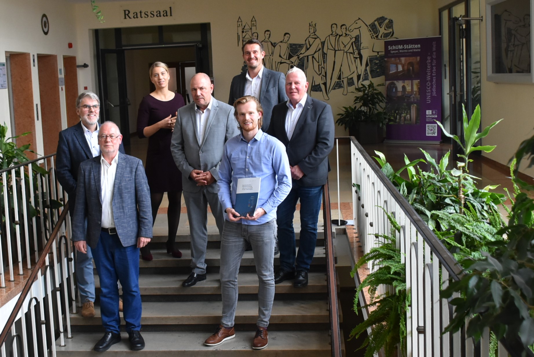 Freuen sich über die Fördermittelzusage aus Berlin: Bürgermeisterin Stephanie Lohr, Tim Wiedemann, Geschäftsführer der IHK Rheinhessen (hintere Reihe), Joachim Kramer, Bereichsleiter Gesellschaft und Wirtschaft, Oberbürgermeister Adolf Kessel, Kai Hornuf, Stadtmarketingverein Worms (mittlerer Reihe) Helmut Emler, Vorsitzender Stadtmarketingverein Worms und Stadtentwicklungsmanager Manuel Schapher (vordere Reihe). Quelle: Stadt Worms.