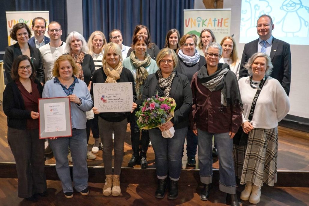 Verliehen wurde das Zertifikat im Rahmen einer Feierstunde mit Stephanie Rieth (Bevollmächtigte des Generalvikars im Bistum Mainz), Nicola Adick (Dezernentin für Caritas & Soziales im Bistum Mainz) und Daniel Poznanski (Vorstand des Unikathe Kita-Zweckverbands im Bistum Mainz). „Das ist eine tolle Bestätigung und zeigt, wie wichtig unsere Arbeit in den Kitas für die Kinder selbst, aber auch die Familien und den Sozialraum ist“, so Fachbereichsleiter Eric Niekisch – dessen Dank der engagierten Leitung Sabine Selig, ihrer Stellvertreterin Kristina Schmitt und dem ganzen Team des Familienzentrums Kita Regenbogen galt.